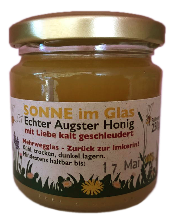 Echter deutscher Honig aus dem vorderen Westerwald - der Augst - das Fluggebiet der Bienen ist Eitelborn, Neuhäusel, Simmern, Kadenbach, Arzbach und manchmal schaffen sie mit viel Energie auch längere Strecken..